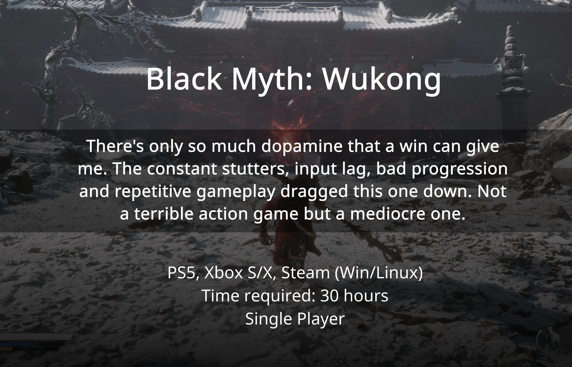 There's only so much dopamine that a win can give me. The constant stutters, input lag, irrelevant progression system and repetitive gameplay dragged Black Myth: Wukong down for me. All of that and the unfairness on some fights... I don't think that this is really a great action game. Not a terrible one though. Just mediocre.