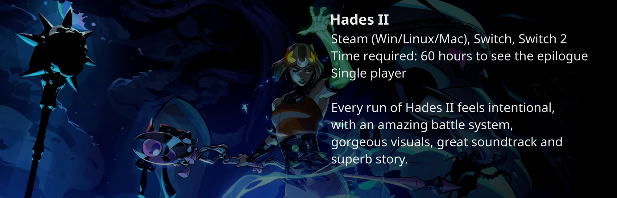 Every run of Hades II feels intentional, with an amazing battle system, gorgeous visuals, great sountrack and superb story.