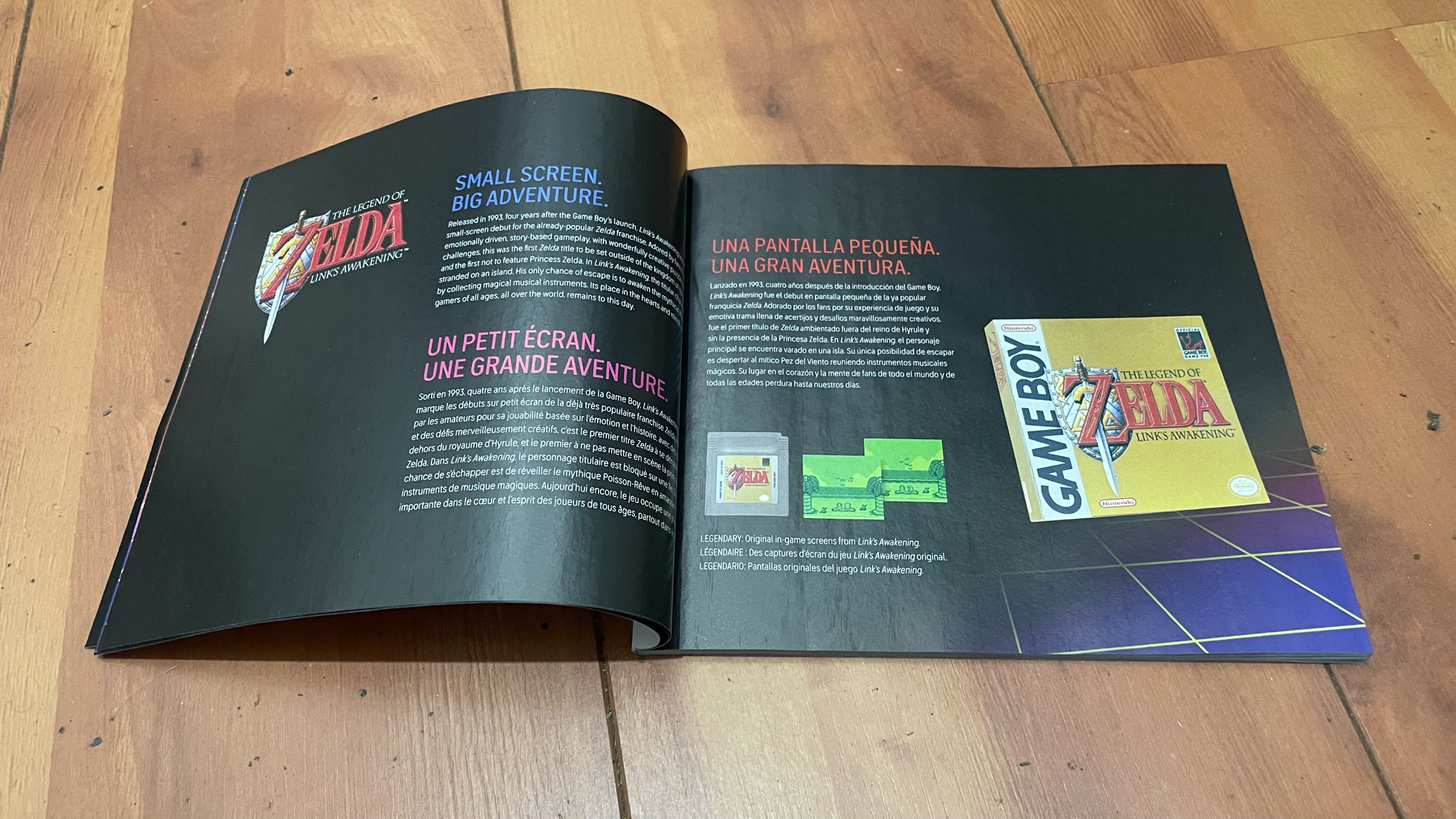 The booklet itself starts with a quick (and multilingual) “introduction” of the Game Boy and the two referenced games in this package – Link's Awakening and Super Mario Land: