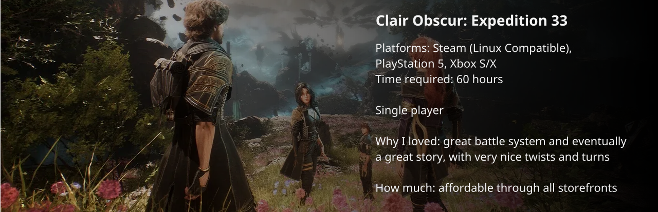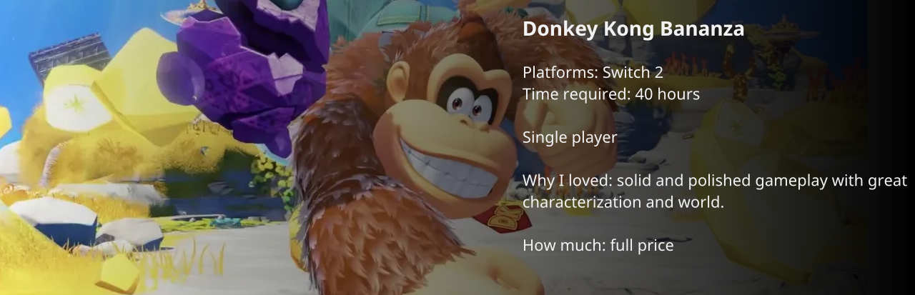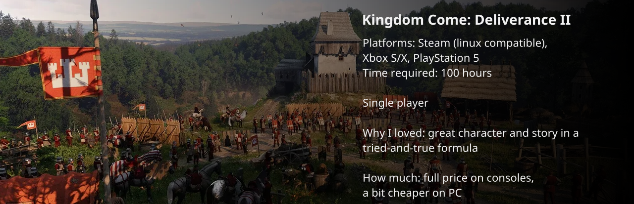 This year was PACKED with RPGs! One of the biggest surprises for me was Kingdom Come: Deliverance II. Although it isn't one of the most innovative games I've played, the overall story and character progress is extremely well done.