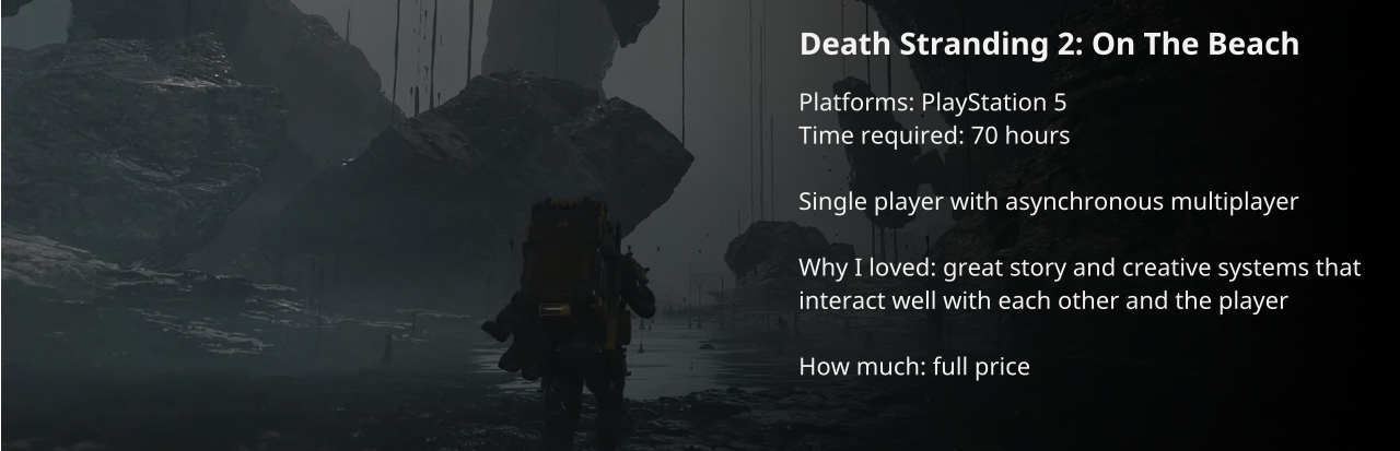 Yeah the new Kojima game is great. Because Death Stranding 1 did so much legwork to establish this twisted world rules and tone, I find that Death Stranding 2: On The Beach finally could tell a good story with interesting characters and mechanics.