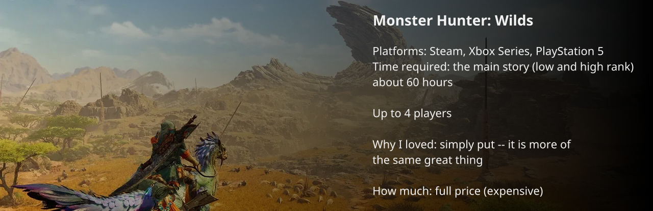 Other game that I had a blast this year playing with other people was Monster Hunter: Wilds. Although not as good as the previous generation starter with "Worlds" for me, it is still a very, very good boss battle simulator.