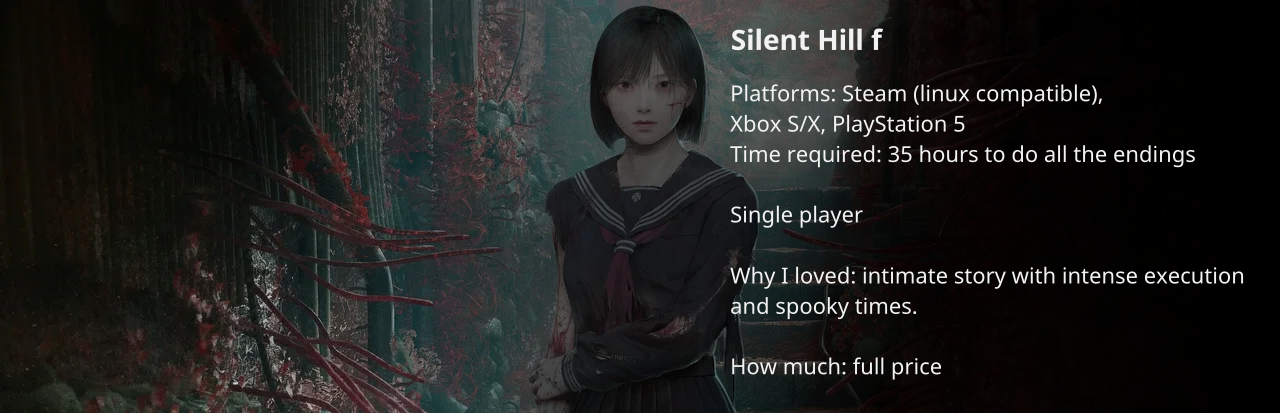Silent Hill f was, first and foremost, a very good character study and it really made me feel the protagonist's suffering. The difficulty can be sometimes irritating and it is one of those games that the campaign needs to be played multiple times to really understand it, but it is worth it and I really recommend.