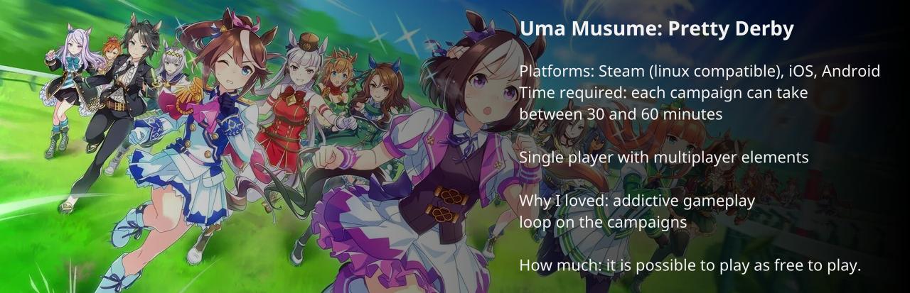 Uma Musume: Pretty Derby was released this year for mobile devices and PC through emulation on Steam. Yeah, a gacha... actually reached my best of the year. It features a bad monetization model and some designs are too much, with a story that wasn't that engaging for me.