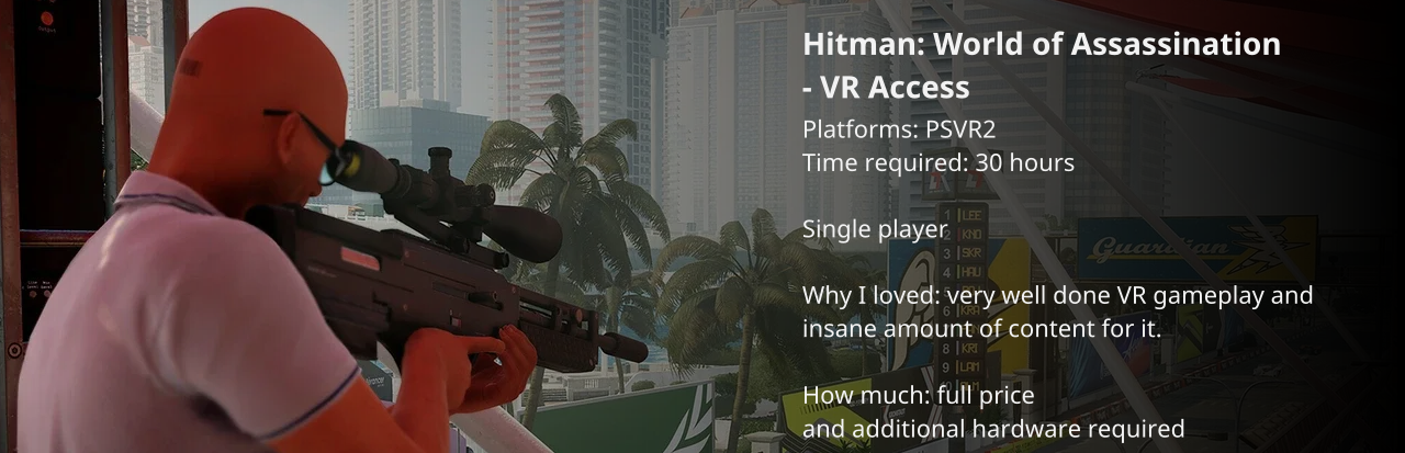 This year I purchased a VR headset for the PlayStation 5. It was meant to be, as Hitman: World of Assassination was released for the PSVR2 this year.