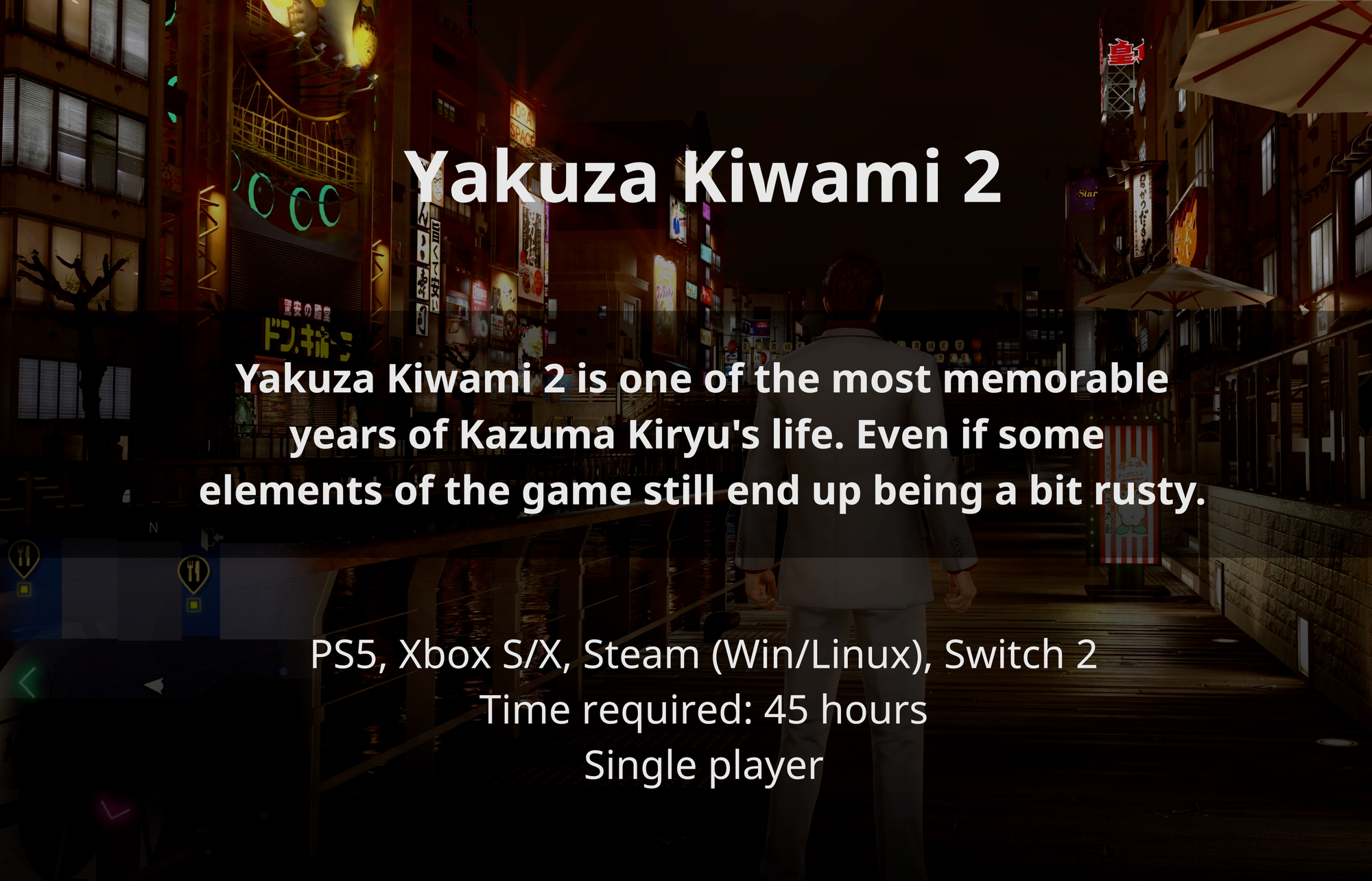 Yakuza Kiwami 2 is a fun time, all things considered. Nice, rewarding and addictive. A very memorable year on Kazuma Kiryu's life.