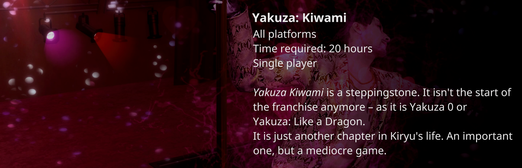 The remake of the first game is a steppingstone. It isn't the start of the franchise anymore – as it is Yakuza 0 or Yakuza: Like a Dragon. It is just another chapter in Kiryu's life. An important one, but a mediocre game.